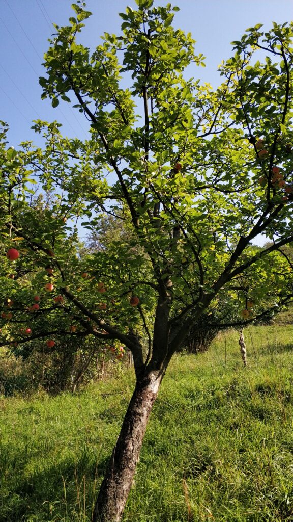 Alle unsere Bäume werden nicht gespritzt. Die natürliche Düngung erfolgt durch Schafe, die aus ökologischen Gründen über den Sommer zur Beweidung der Wiesen eingesetzt werden.